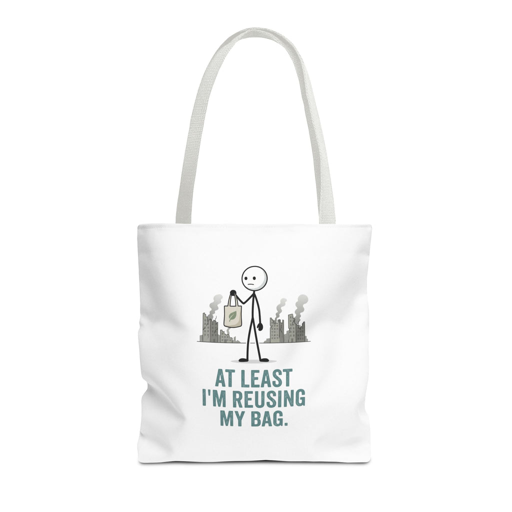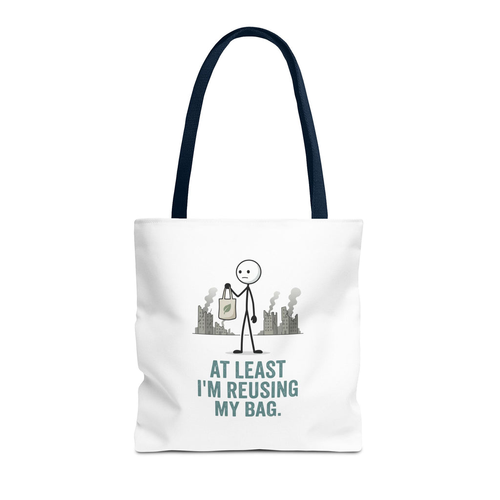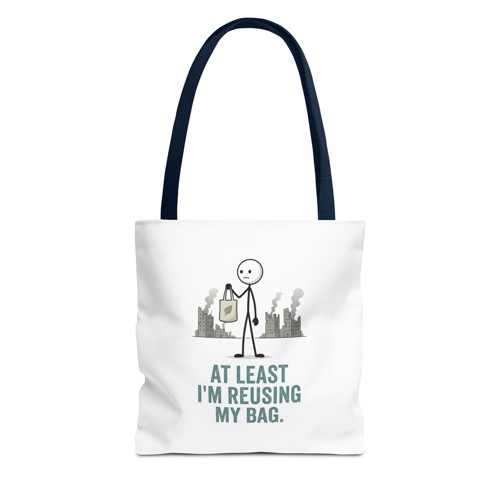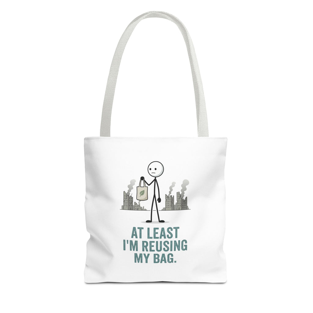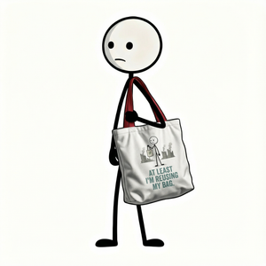 The ice caps melted, the economy collapsed, and the cities are currently on fire. But look at you, doing your part. This tactical inventory expansion unit proves that while you couldn't save civilization, you can still save 5 cents at the grocery store (if one existed). Featuring a proud survivor standing amidst the smoking ruins of society, holding a reusable bag with a green leaf logo, this tote is the ultimate flex for the end times. It screams, "I may be looting this abandoned pharmacy, but I am not part of the landfill problem."