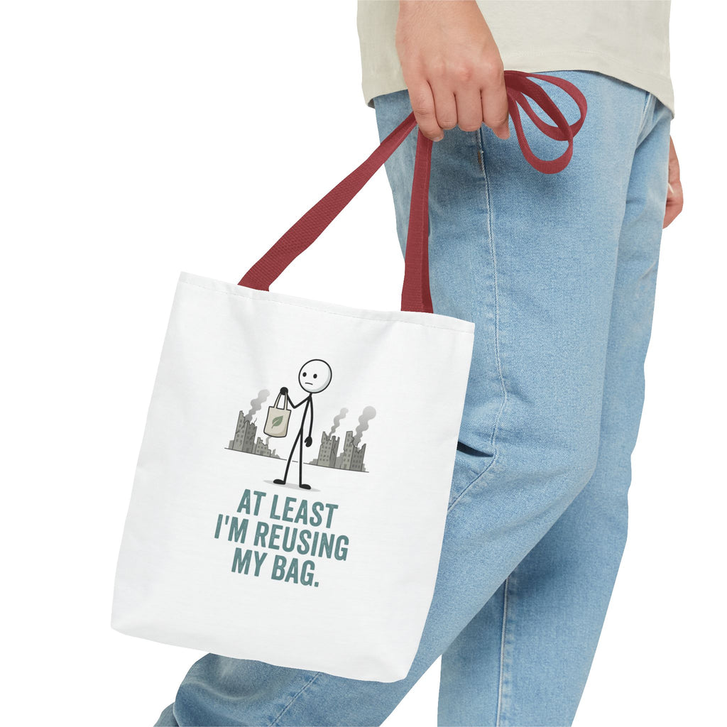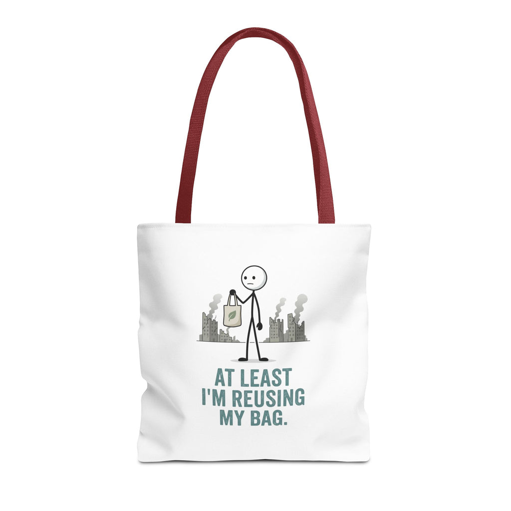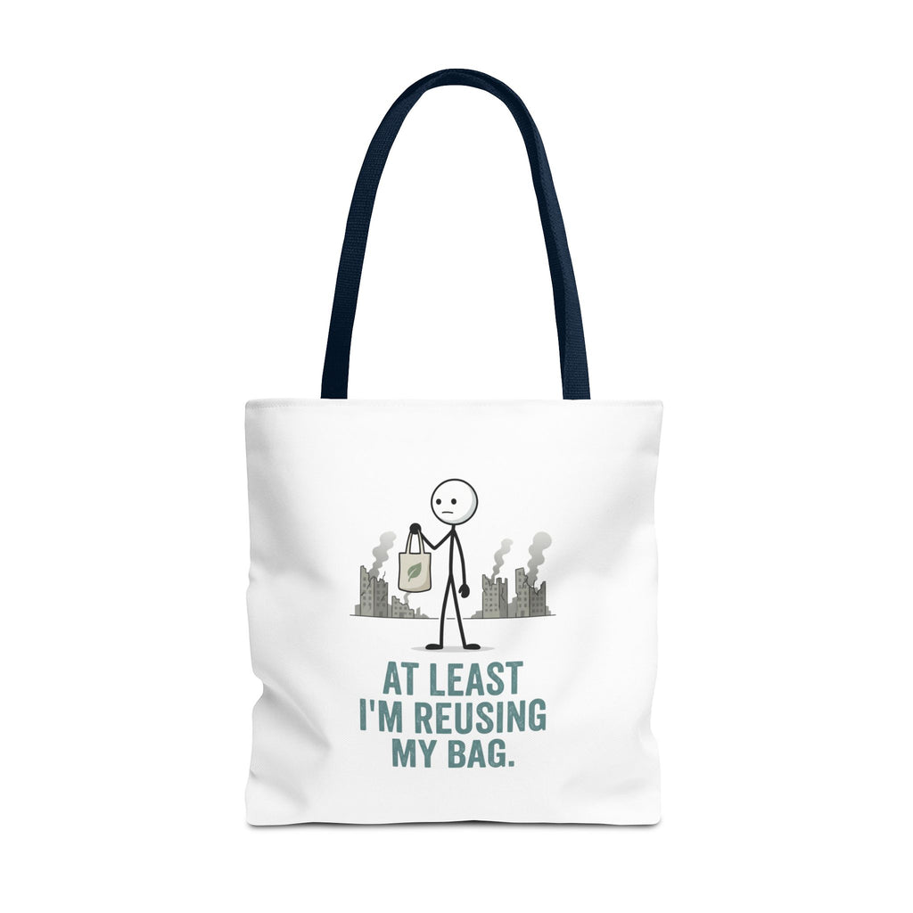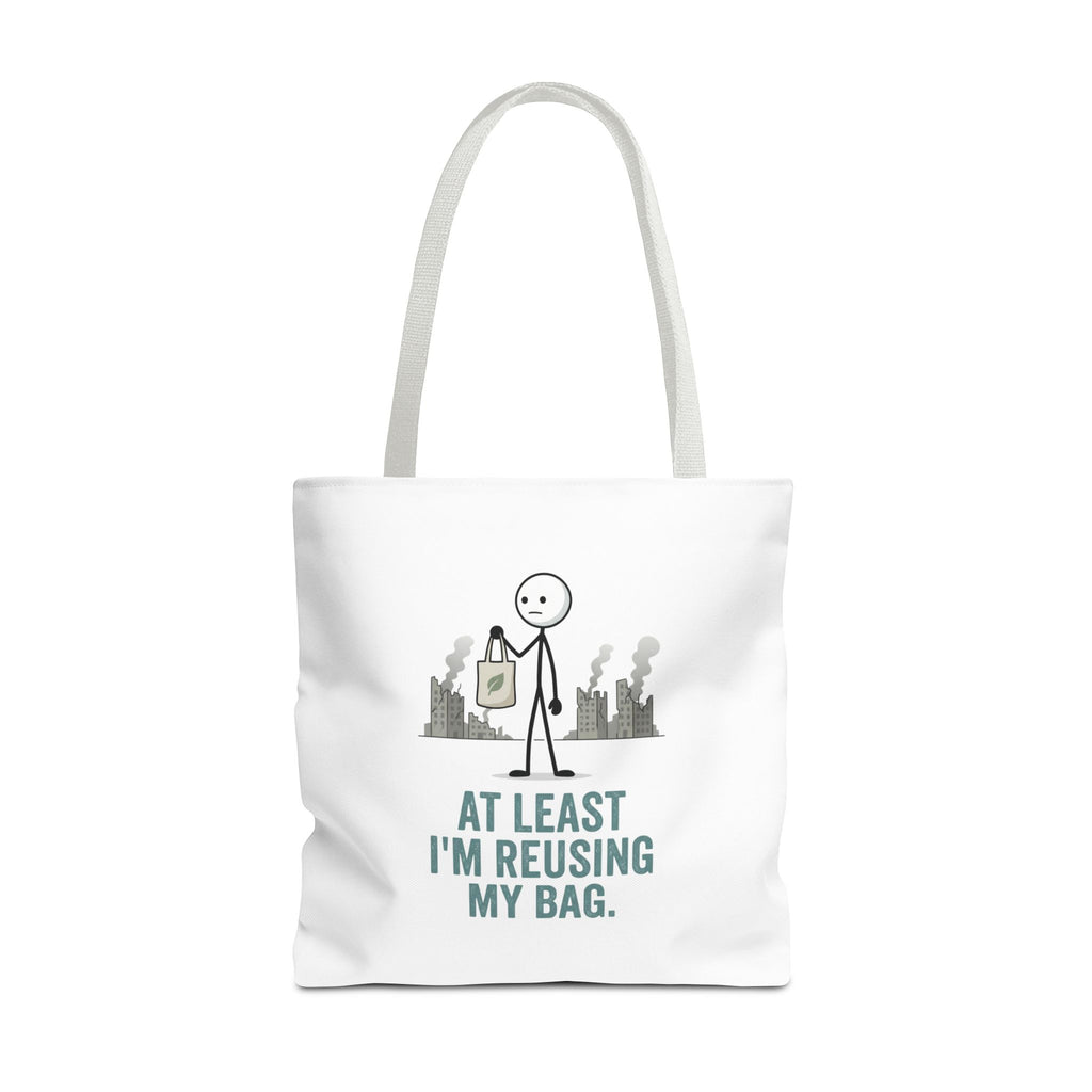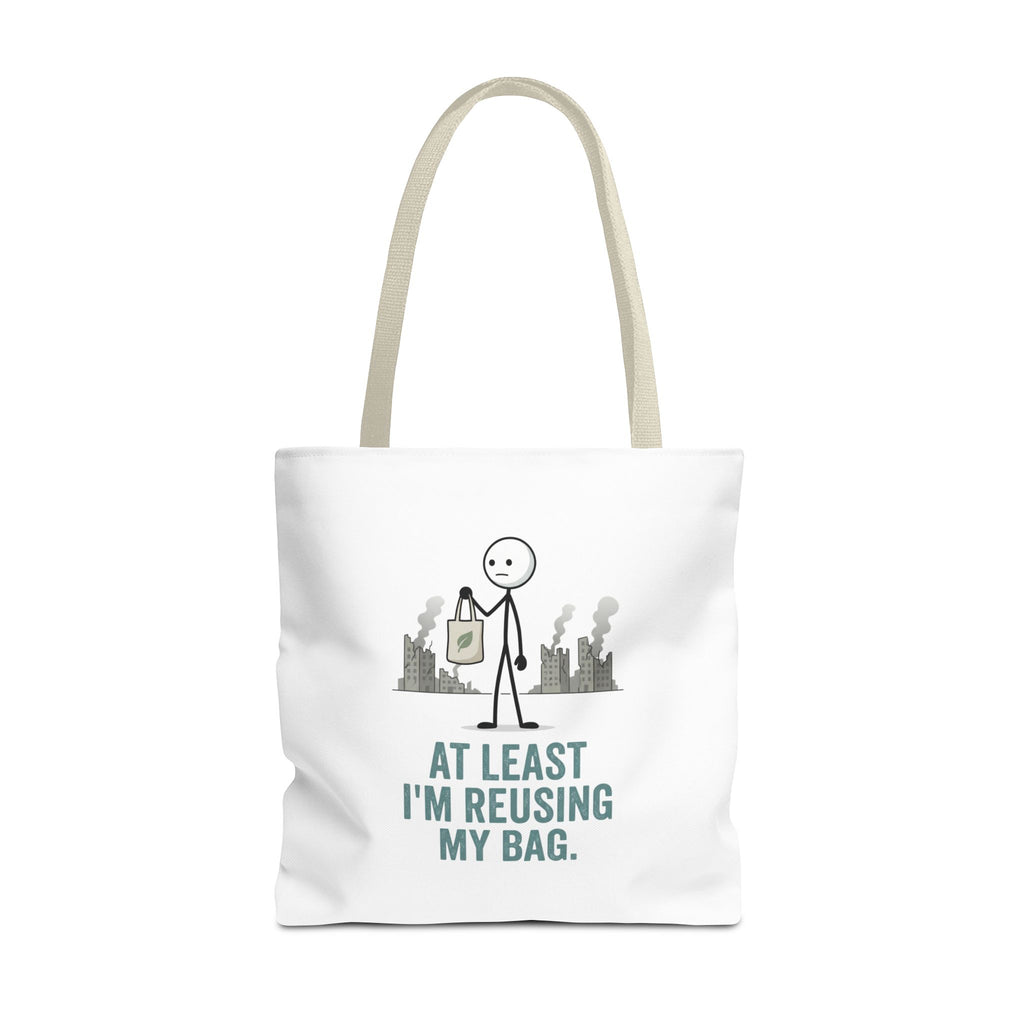 The ice caps melted, the economy collapsed, and the cities are currently on fire. But look at you, doing your part. This tactical inventory expansion unit proves that while you couldn't save civilization, you can still save 5 cents at the grocery store (if one existed). Featuring a proud survivor standing amidst the smoking ruins of society, holding a reusable bag with a green leaf logo, this tote is the ultimate flex for the end times. It screams, "I may be looting this abandoned pharmacy, but I am not part of the landfill problem."