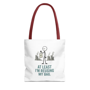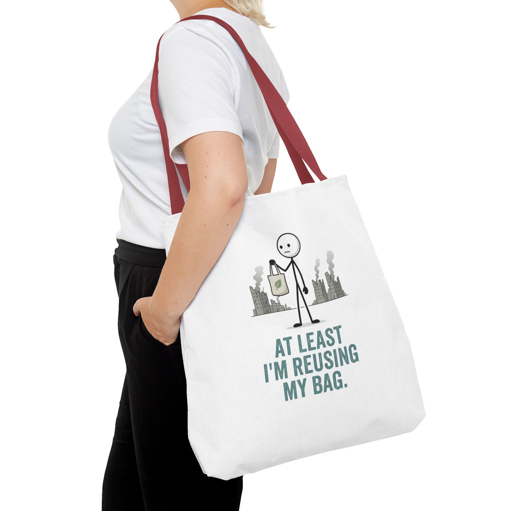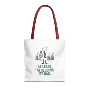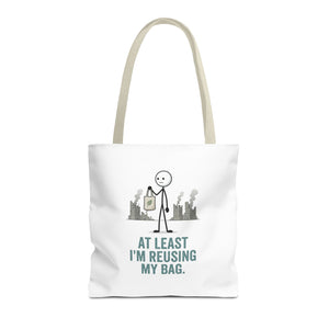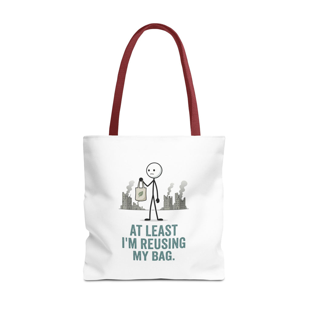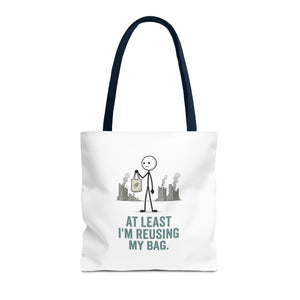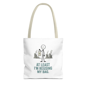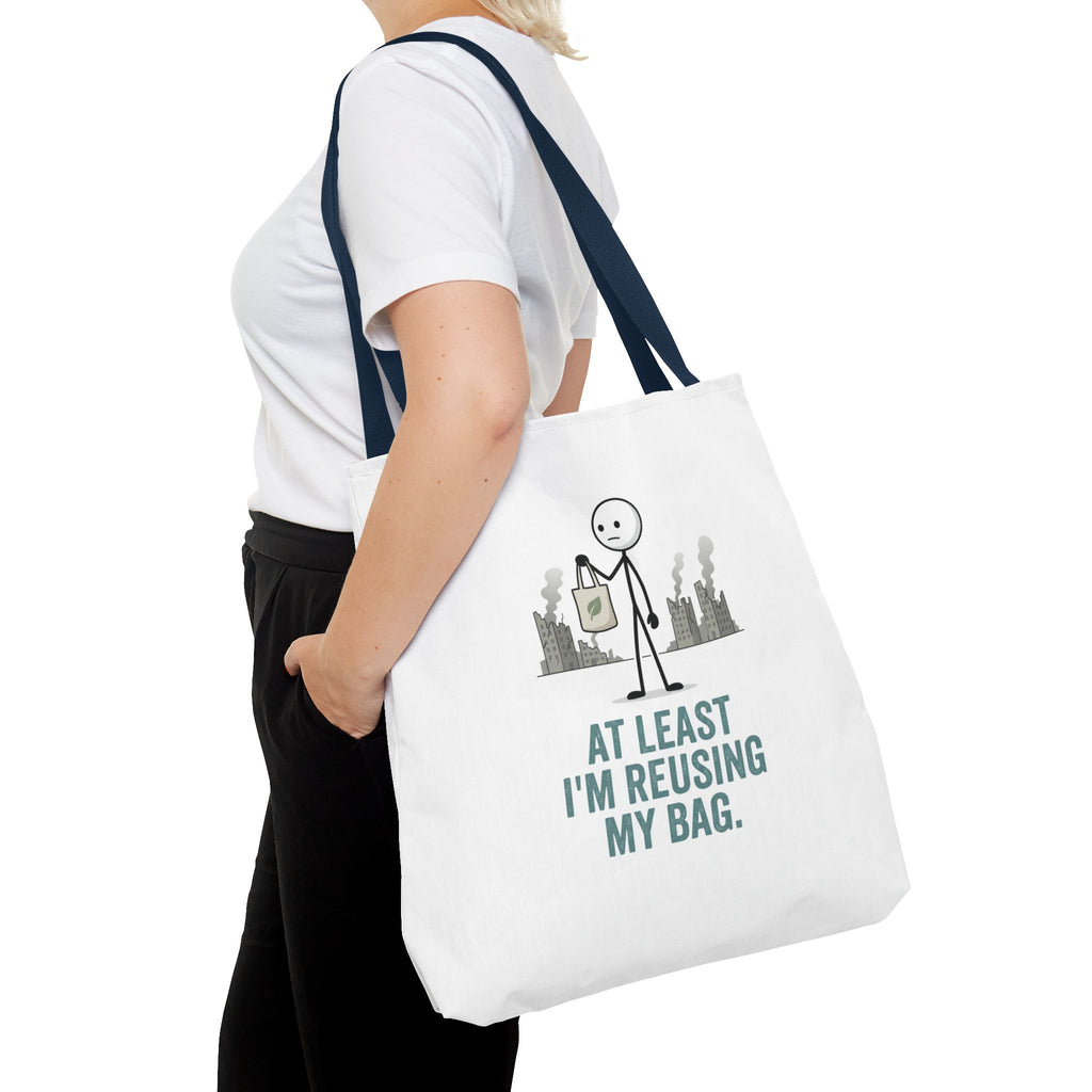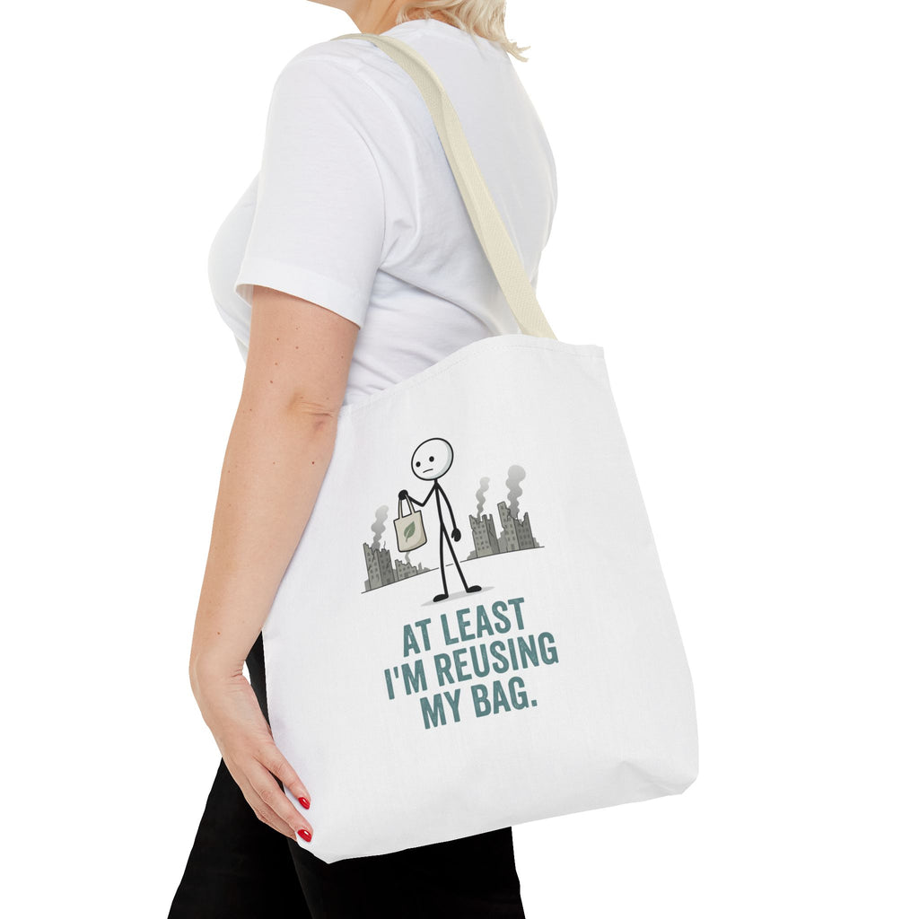 The ice caps melted, the economy collapsed, and the cities are currently on fire. But look at you, doing your part. This tactical inventory expansion unit proves that while you couldn't save civilization, you can still save 5 cents at the grocery store (if one existed). Featuring a proud survivor standing amidst the smoking ruins of society, holding a reusable bag with a green leaf logo, this tote is the ultimate flex for the end times. It screams, "I may be looting this abandoned pharmacy, but I am not part of the landfill problem."