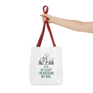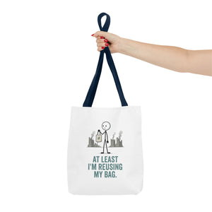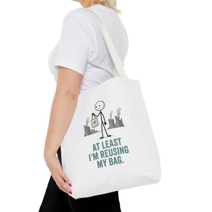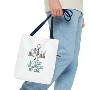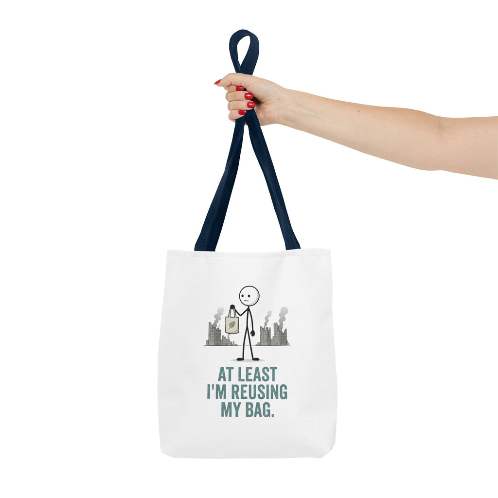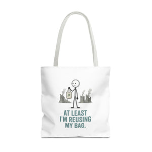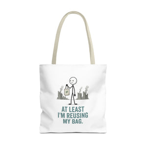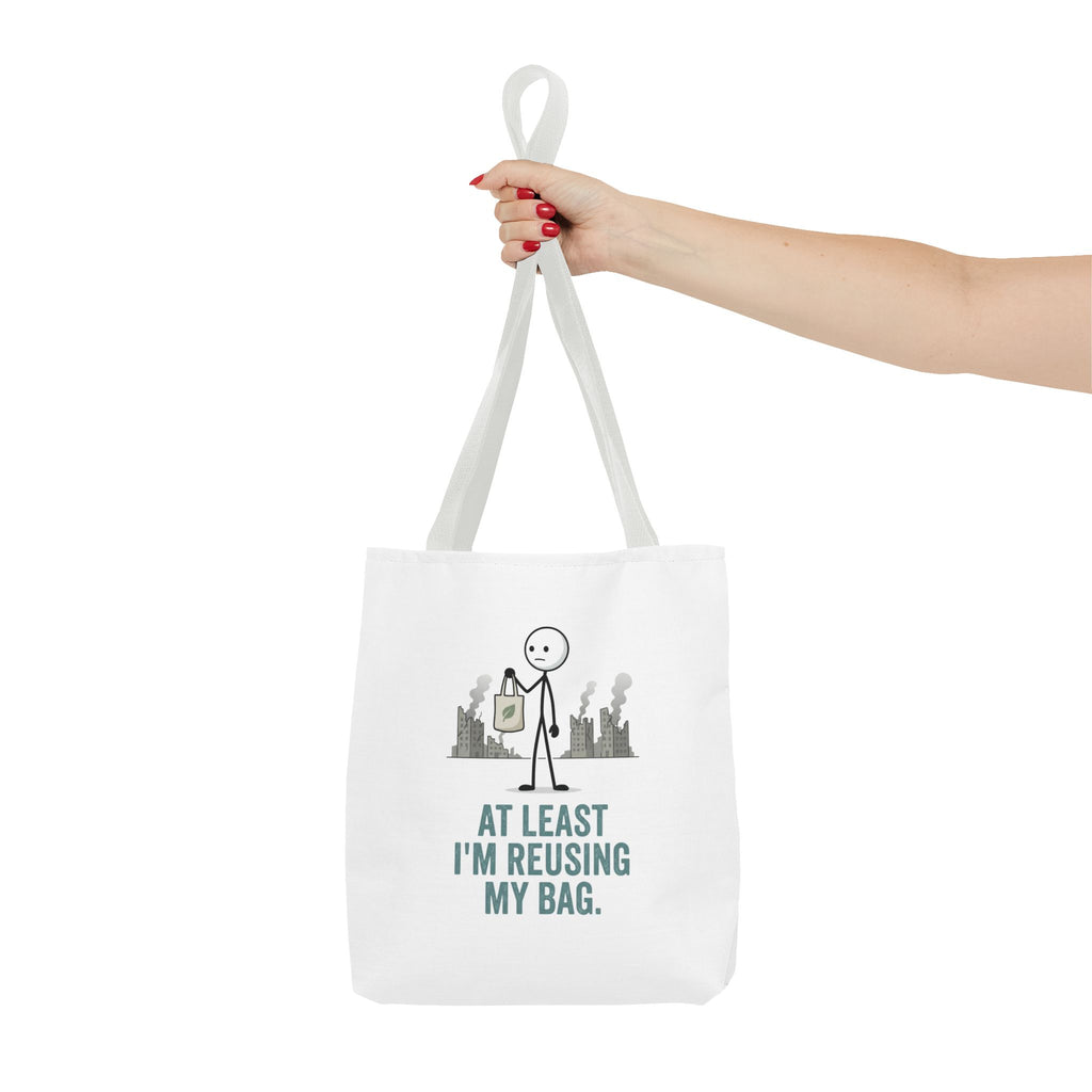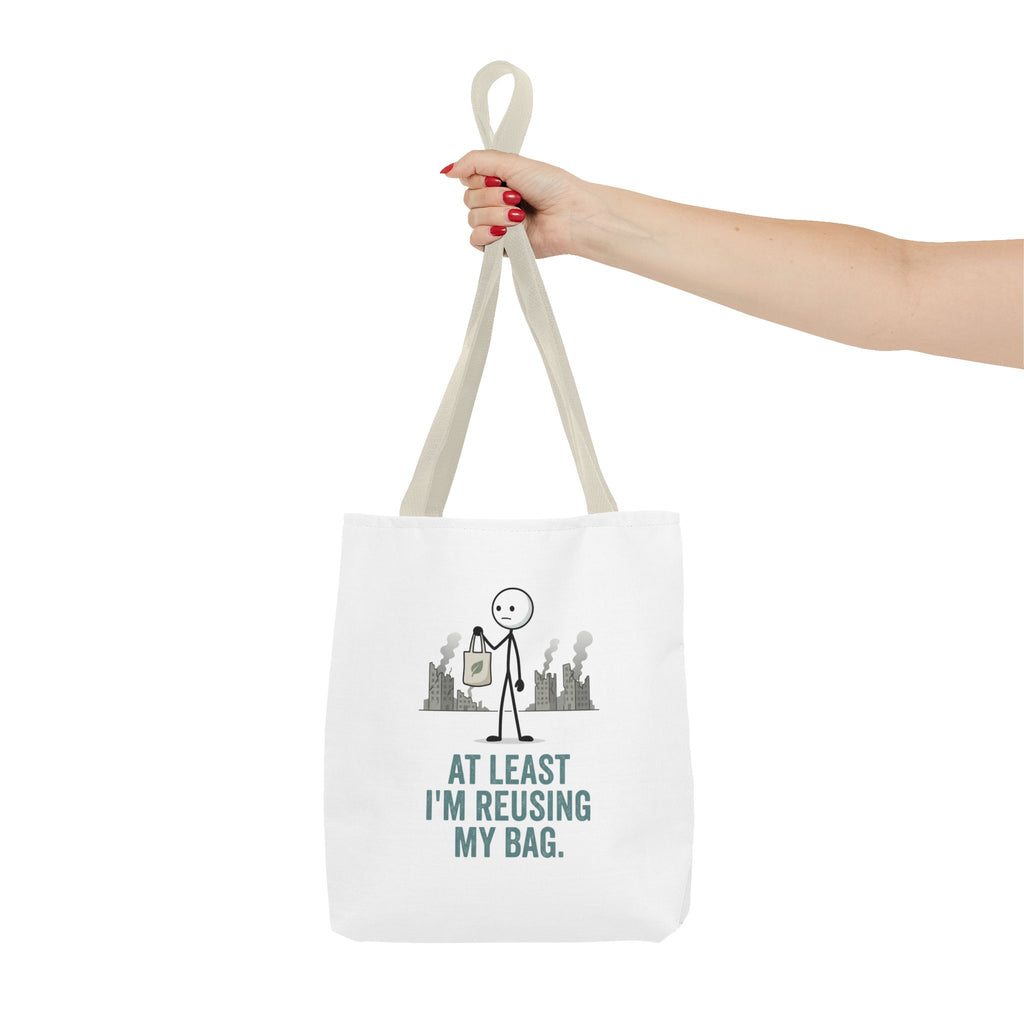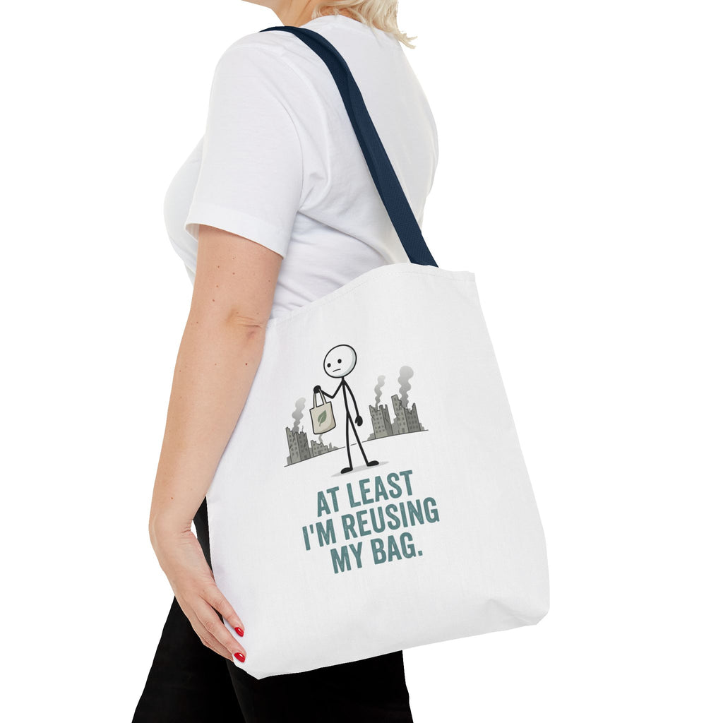 The ice caps melted, the economy collapsed, and the cities are currently on fire. But look at you, doing your part. This tactical inventory expansion unit proves that while you couldn't save civilization, you can still save 5 cents at the grocery store (if one existed). Featuring a proud survivor standing amidst the smoking ruins of society, holding a reusable bag with a green leaf logo, this tote is the ultimate flex for the end times. It screams, "I may be looting this abandoned pharmacy, but I am not part of the landfill problem."
