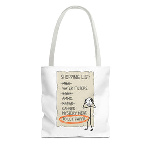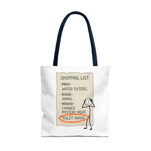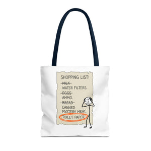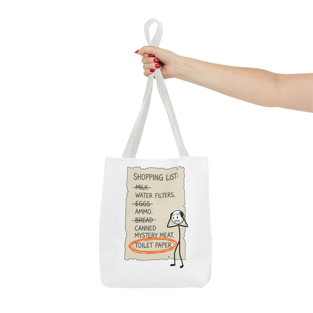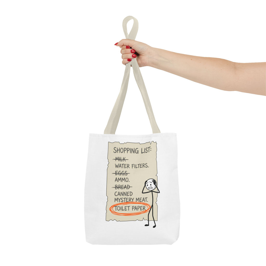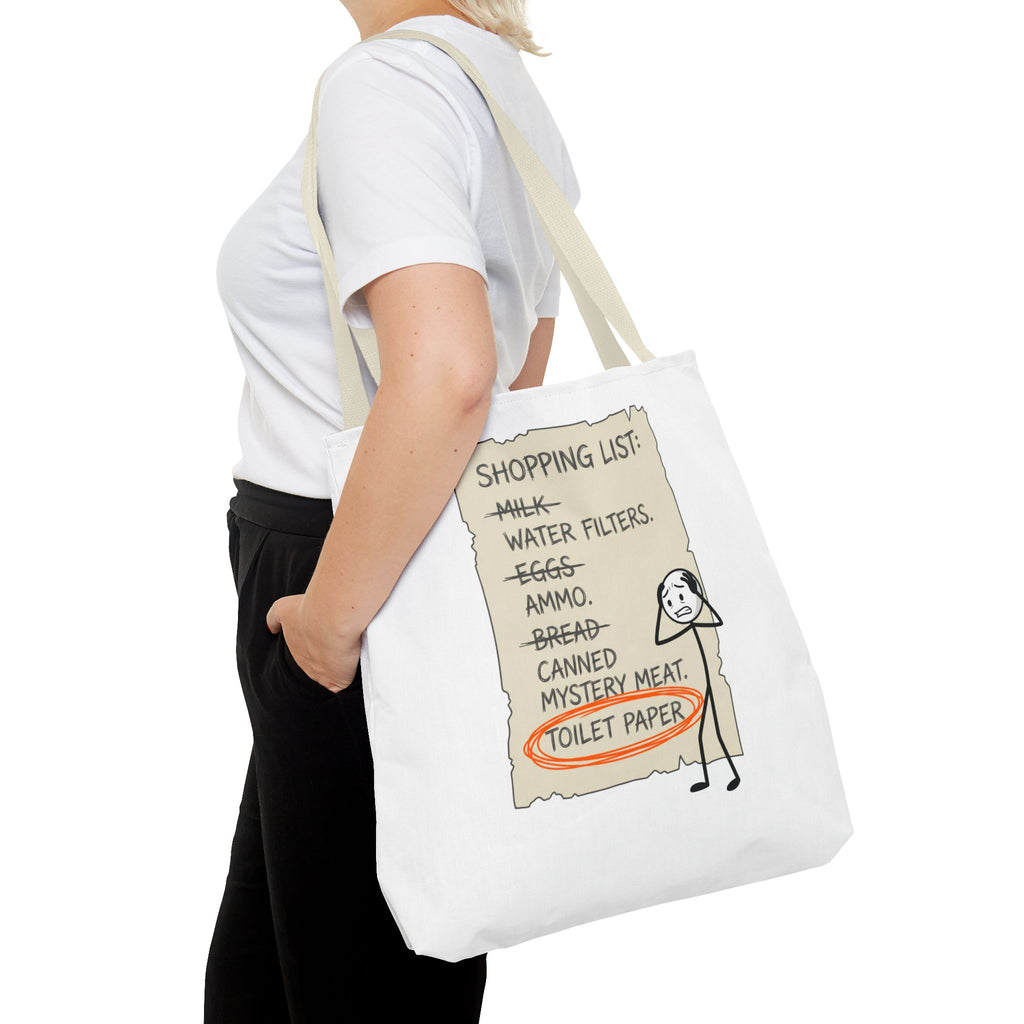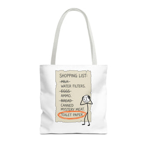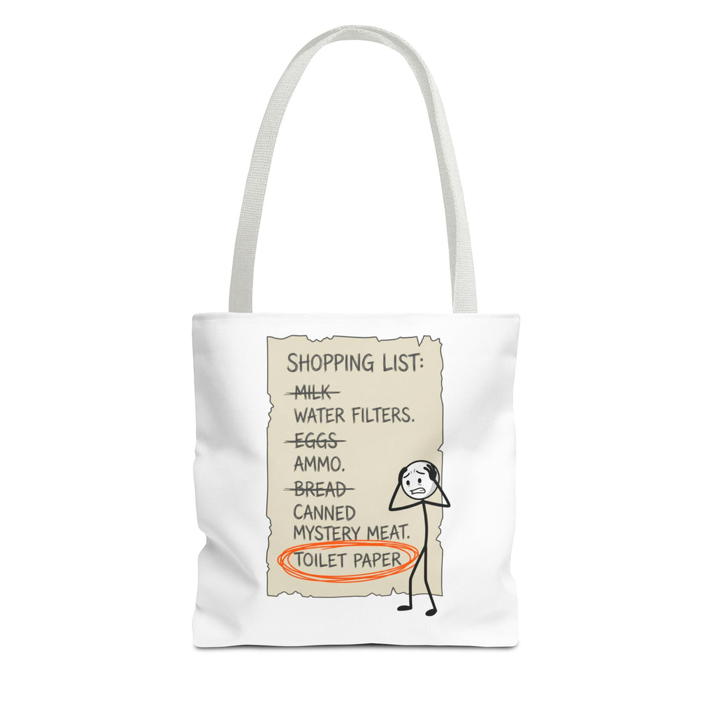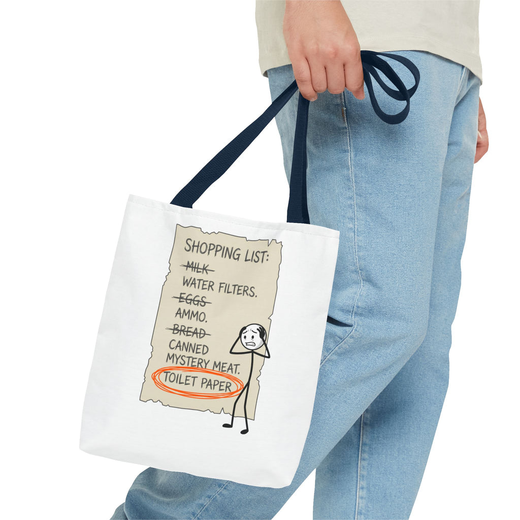 In the post-society economy, we don't trade in crypto or gold; we trade in 2-ply. This tactical haulage unit displays the definitive scavenger's manifesto. While amateurs are looking for "Milk" or "Ammo," the true survivalist knows the real panic sets in when the bathroom supply drops to zero. The graphic features a distressed operator realizing that the most critical resource is the one highlighted in hazard orange. Use this bag to focus your looting runs on what really matters—because you can survive without bread, but you really don't want to survive without paper.