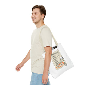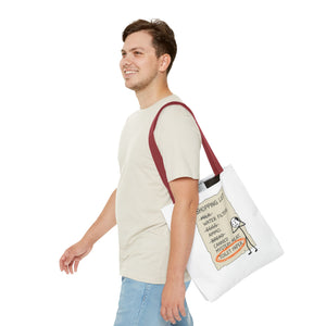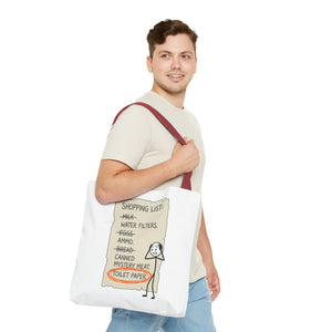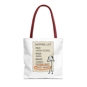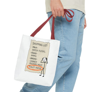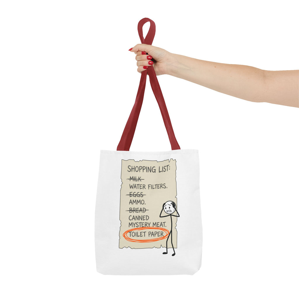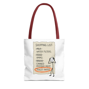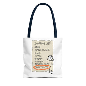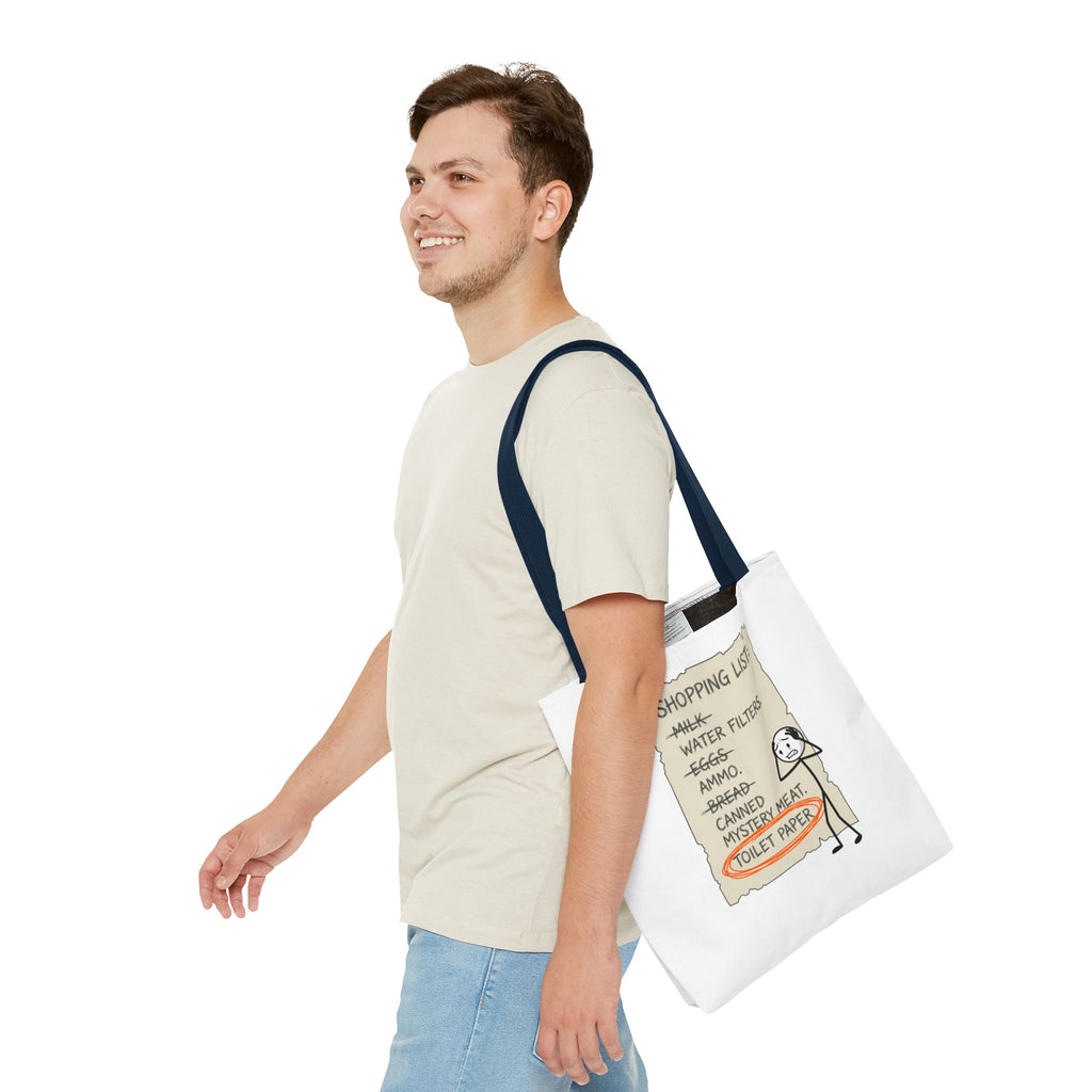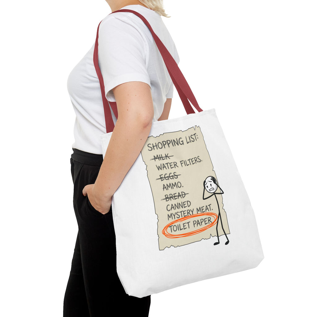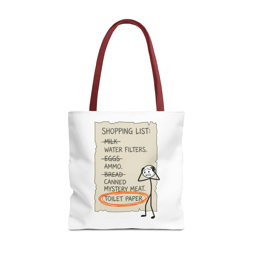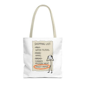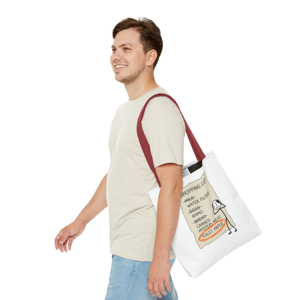 In the post-society economy, we don't trade in crypto or gold; we trade in 2-ply. This tactical haulage unit displays the definitive scavenger's manifesto. While amateurs are looking for "Milk" or "Ammo," the true survivalist knows the real panic sets in when the bathroom supply drops to zero. The graphic features a distressed operator realizing that the most critical resource is the one highlighted in hazard orange. Use this bag to focus your looting runs on what really matters—because you can survive without bread, but you really don't want to survive without paper.
