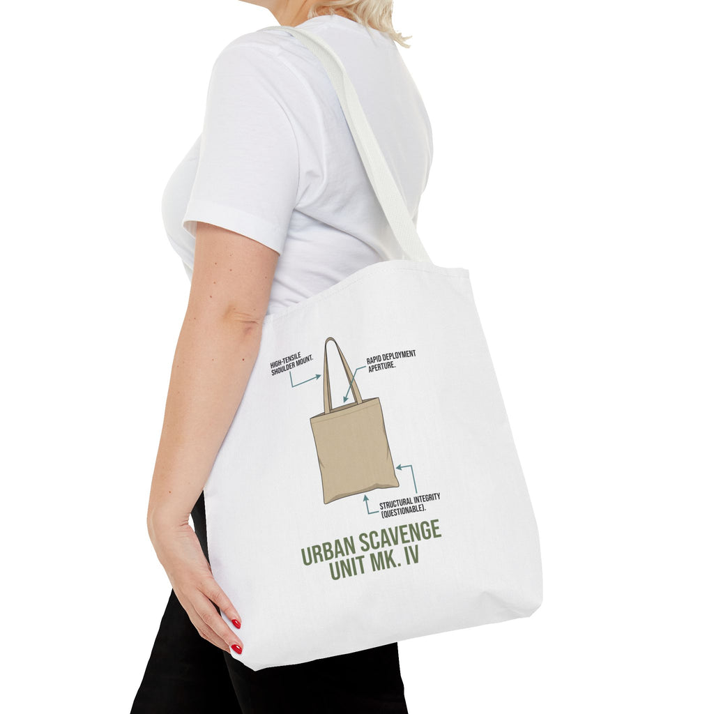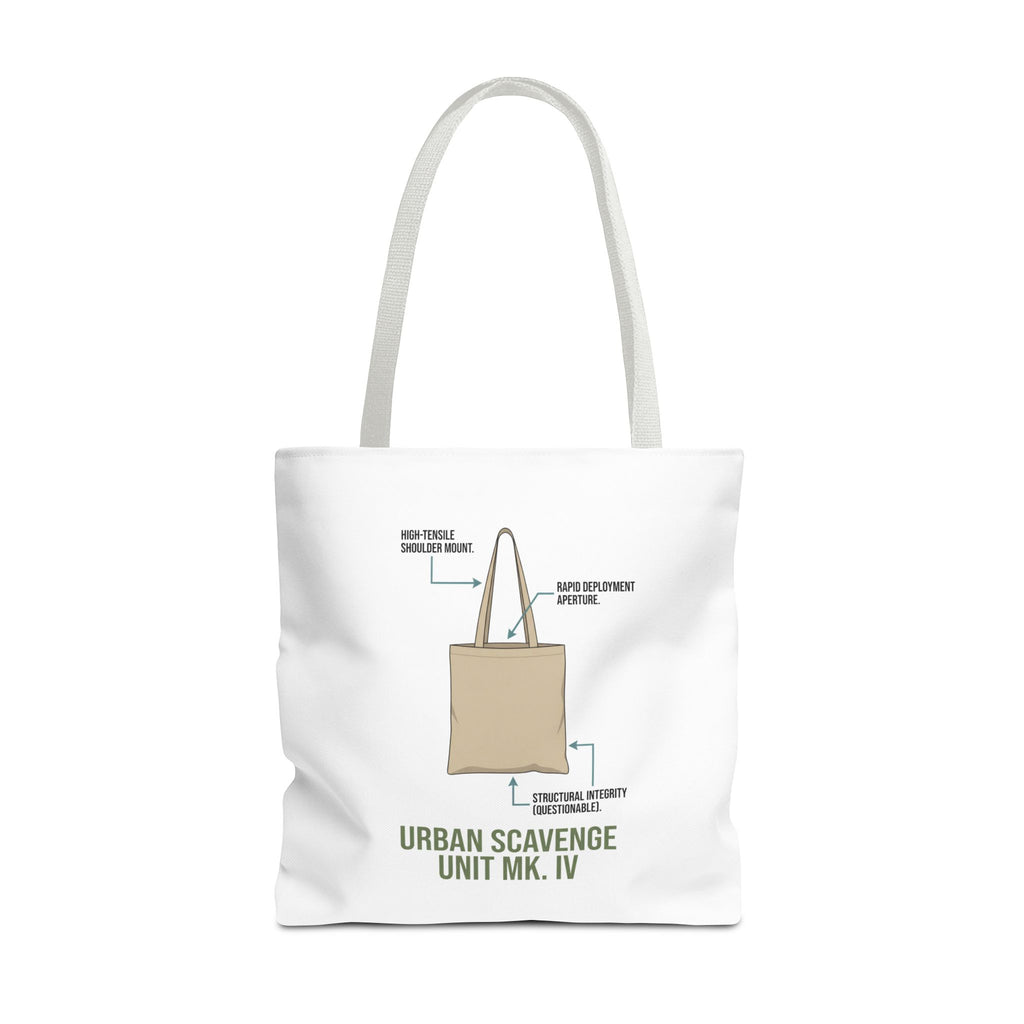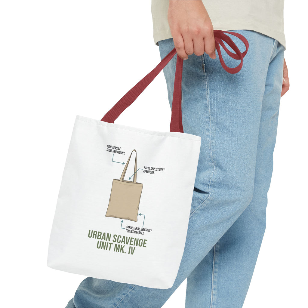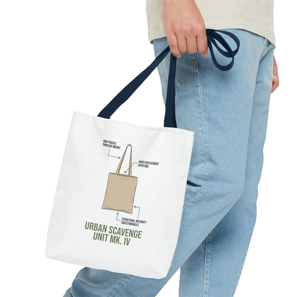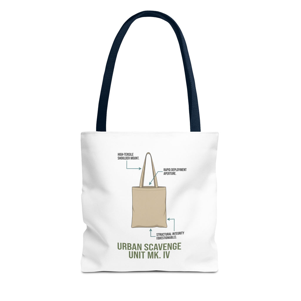 Civilians call it a "tote bag." We call it a tactical resource containment system. This advanced piece of kit upgrades your scavenging run by applying military-grade terminology to a standard canvas sack. Featuring a "High-Tensile Shoulder Mount" (strap) and a "Rapid Deployment Aperture" (big hole), it makes carrying groceries feel like a black-ops mission. The "Mk. IV" designation implies that we have learned significant lessons from the catastrophic failures of Units I through III. Note the disclaimer regarding "Structural Integrity (Questionable)"—load at your own risk.